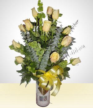 Elegante y perfecto para ocasiones festivas. Este ramo clásico contiene: 12 rosas amarillas con florero y follaje.