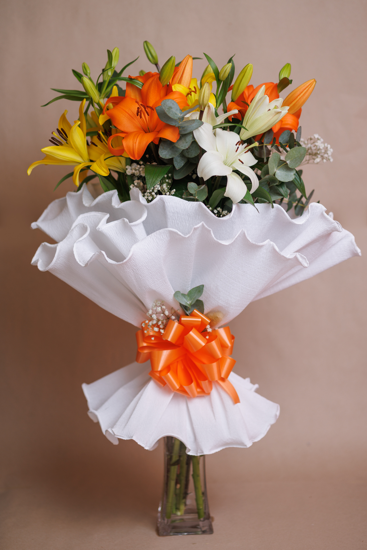 Diseño exclusivo de lirios en tonos cálidos, enmarcado en un elegante envoltorio de papel crespón.